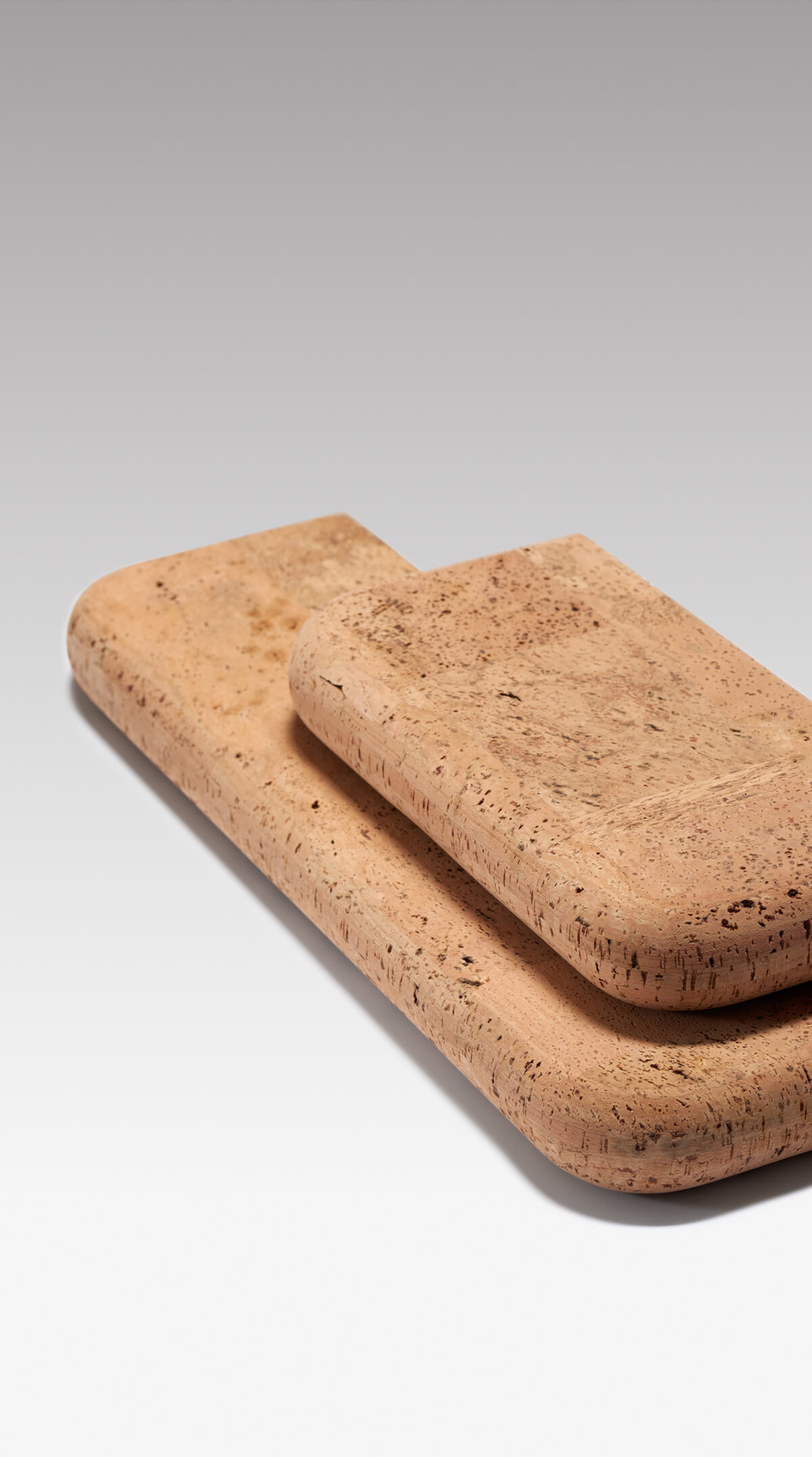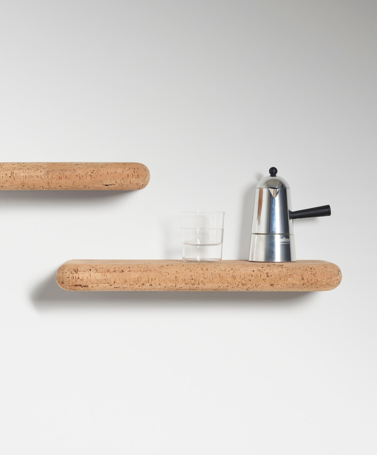 The CORKBOARD SHELF is inspired by driftwood that acquires its soft, rounded form and its texture by contact with water and sand. The irregularities of nature are transformed into a simple and pared-down shape that is repeated in the simplicity of the wall fastening. Lightweight but solid, at the same time, round, geometrical and floating.