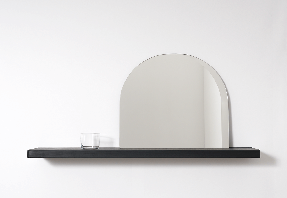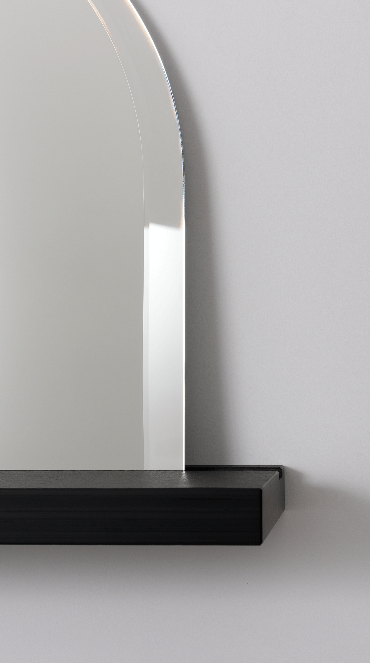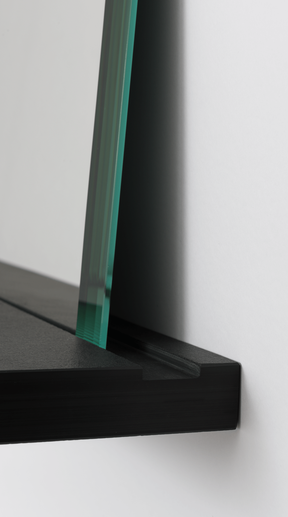 The exploration of limits in the production of antiquated facetted mirrors makes it possible to apply an ancient technique to this contemporary product. The crescent-chamfered edges refract light on one side of the mirror and elegantly frame it in a calm and modern way. The position of the mirror on the natural stone shelf can be adjusted along a milled groove for different interior situations.