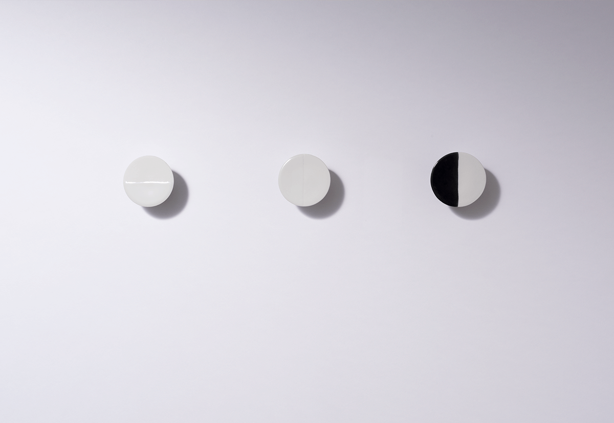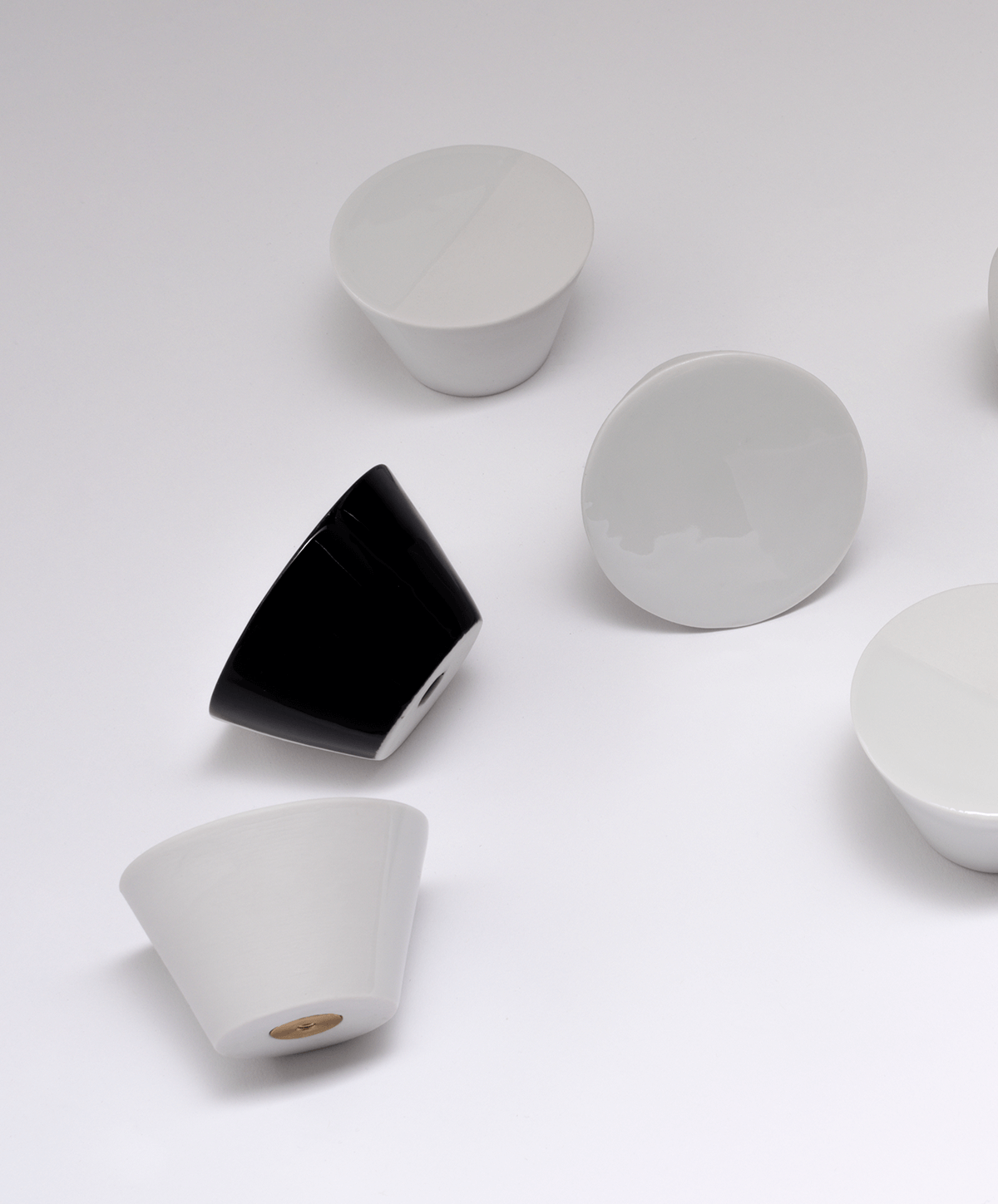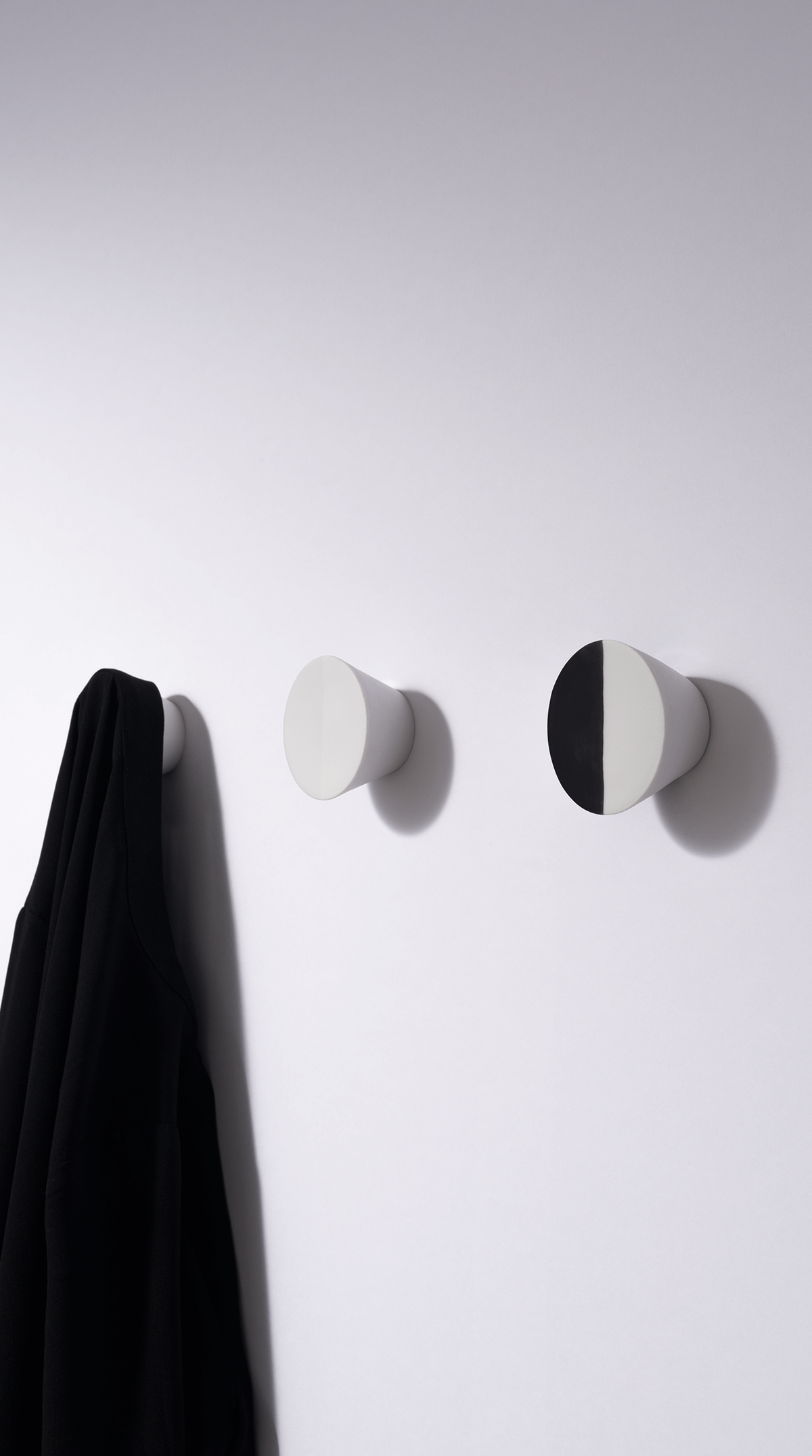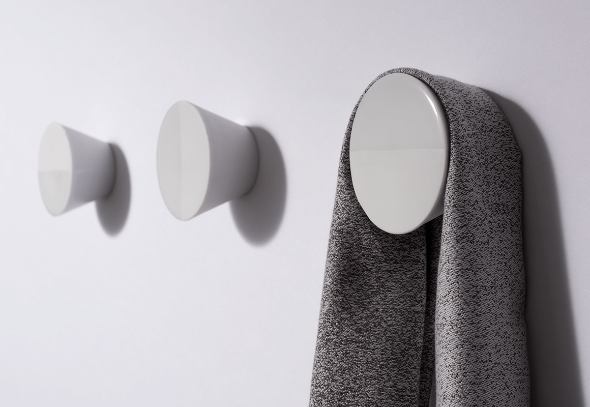 The minimalist knobs are made of porcelain and are half dipped in glaze. This creates a play of shiny and velvety soft surfaces. Depending on how the hooks are attached, this prevents light fabrics from slipping off.