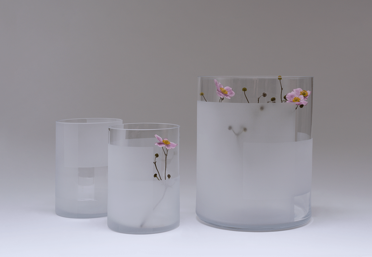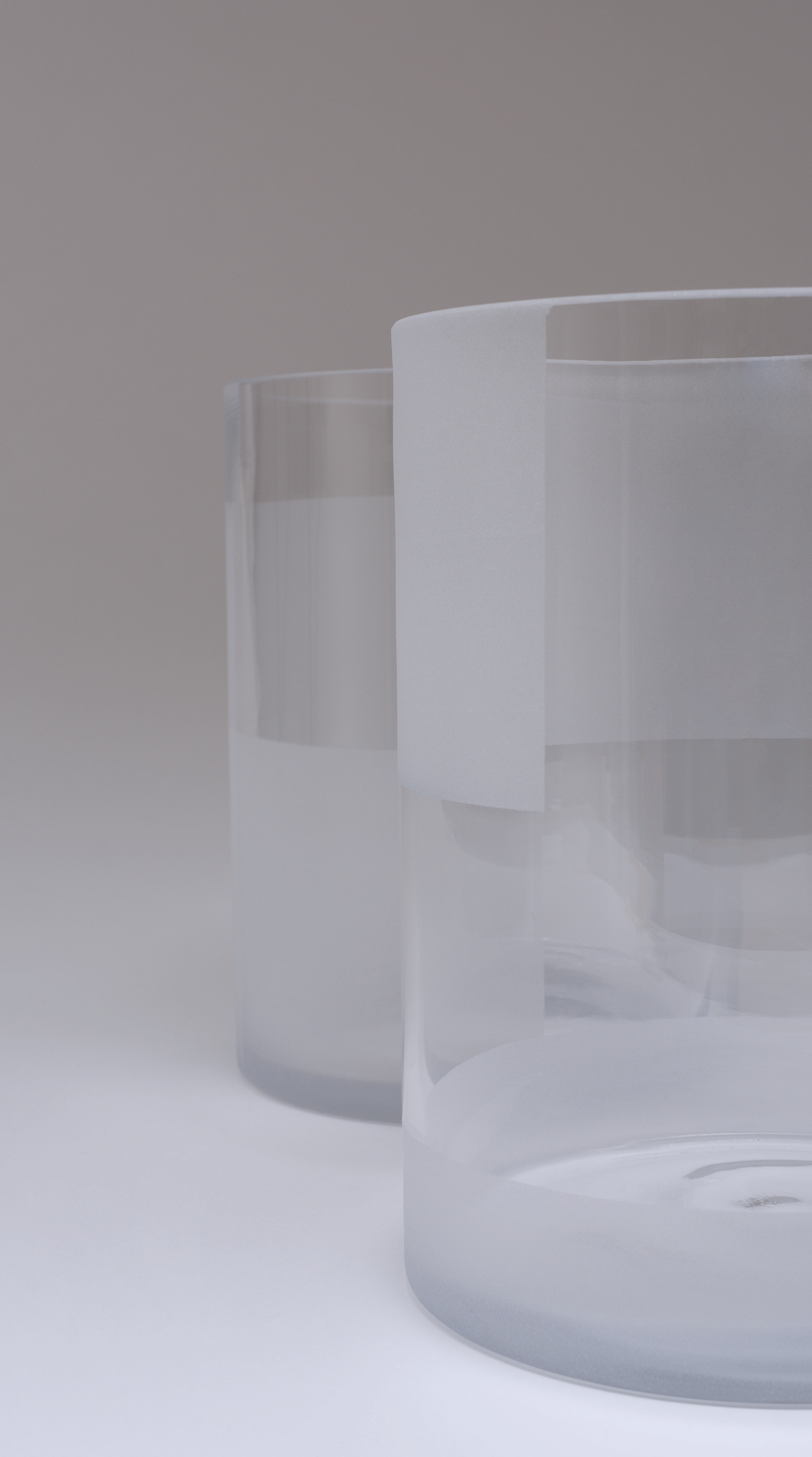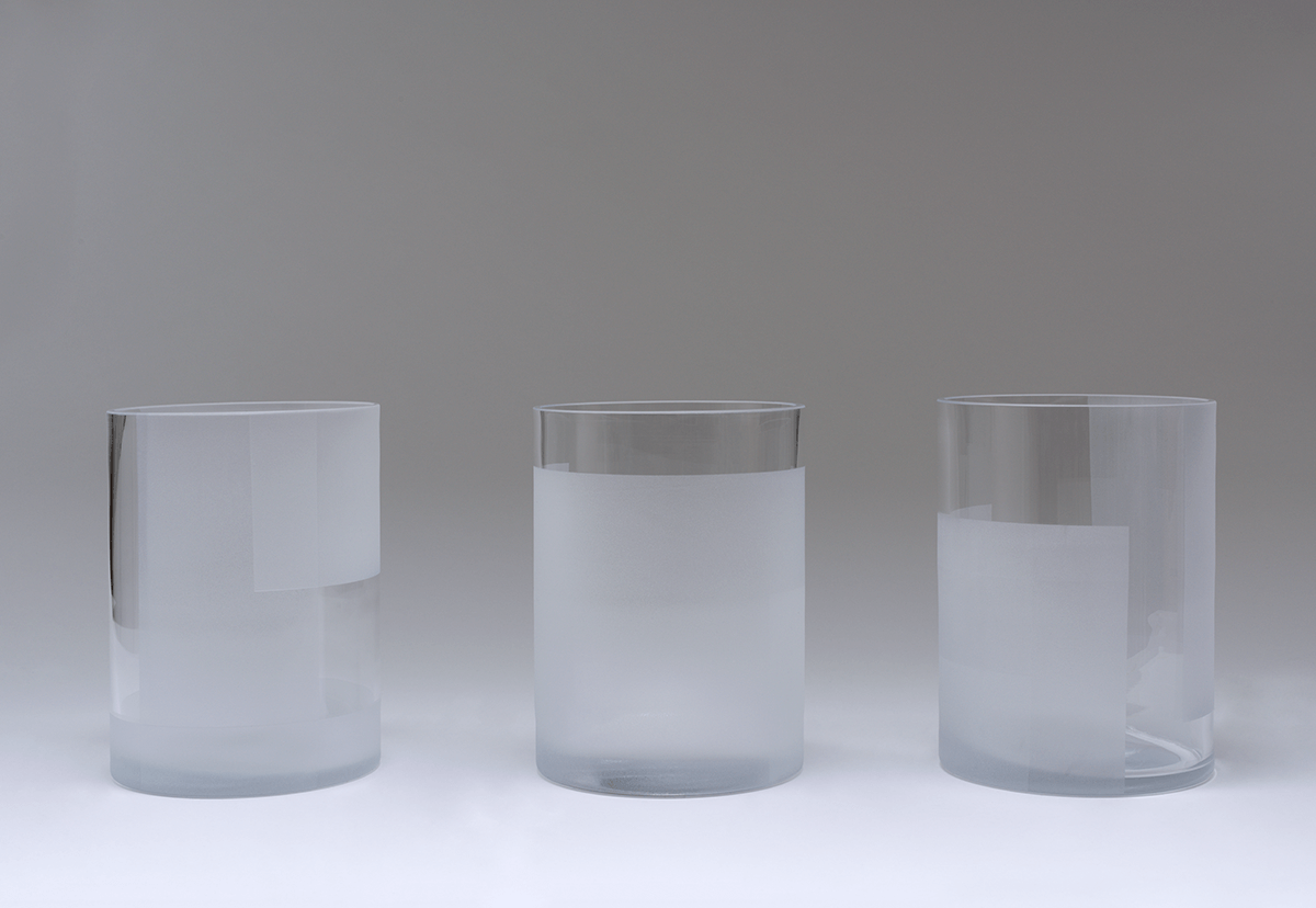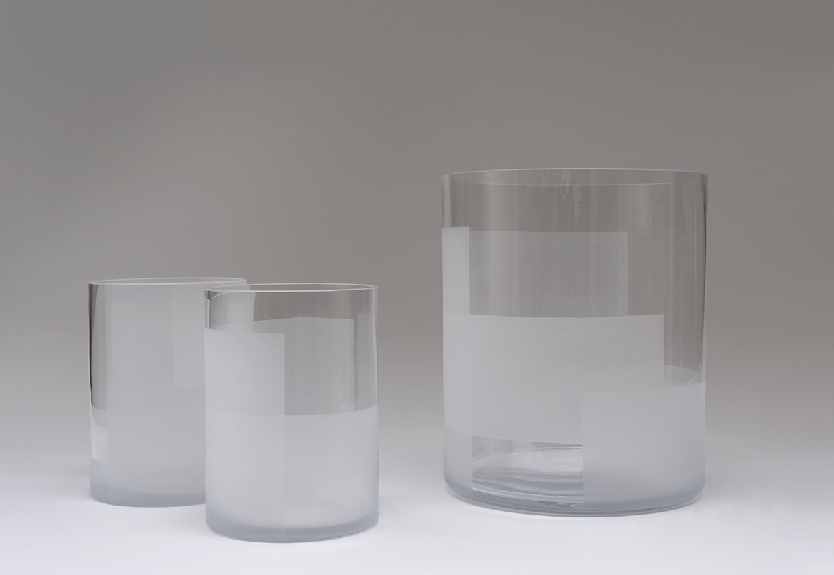 The cylindrical vases LAYER are characterised by sandblasting the surface in layers. Two or three overlapping rectangles in different gradiation provide a common subdivision of area. Thus every vase gets a different translucent graphic look.