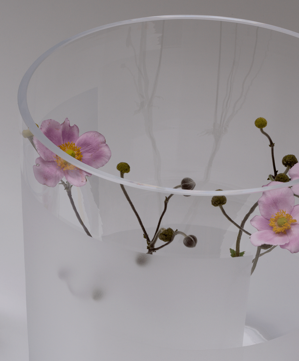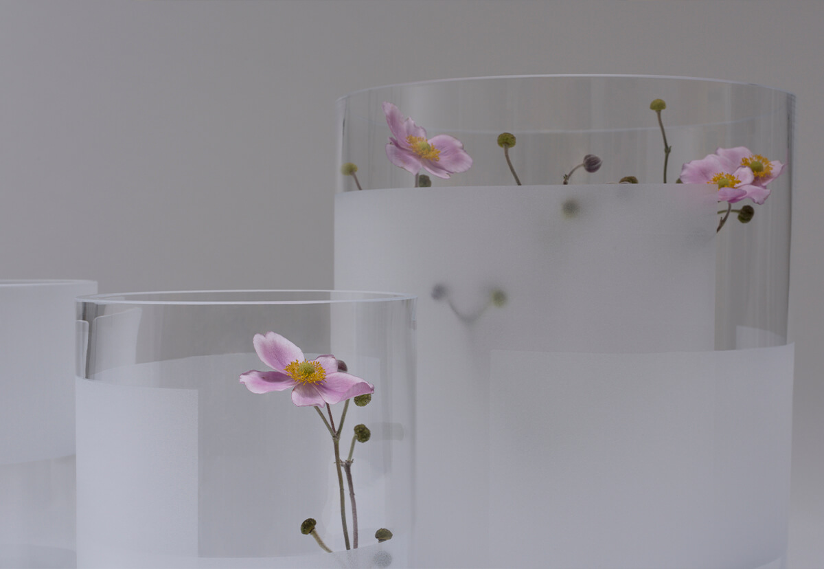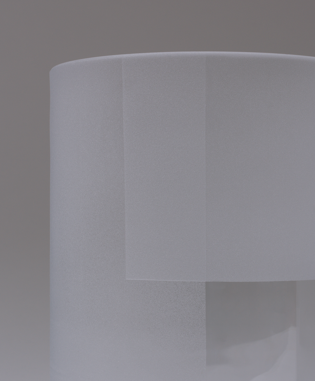 The cylindrical vases LAYER are characterised by sandblasting the surface in layers. Two or three overlapping rectangles in different gradiation provide a common subdivision of area. Thus every vase gets a different translucent graphic look.