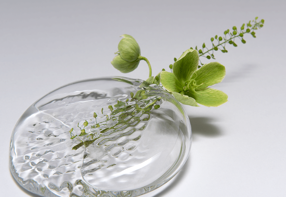 The WAFFLE vase has been created with the help of an antique waffle iron from Paris. WAFFLE is a rather special object: this flat and small vase is made for laying out delicate flower arrangements on a surface.